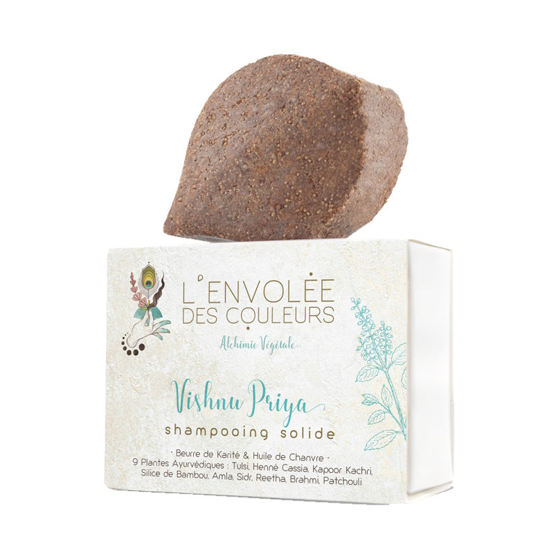 Inspiré de la tradition ayurvédique, le shampoing solide Vishnu Priya associe poudres de plantes et actifs naturels pour purifier le cuir chevelu et fortifier la chevelure. Sa mousse onctueuse nettoie en douceur, apaise et redonne vitalité. Un soin complet qui laisse les cheveux légers, brillants et pleins d’énergie.